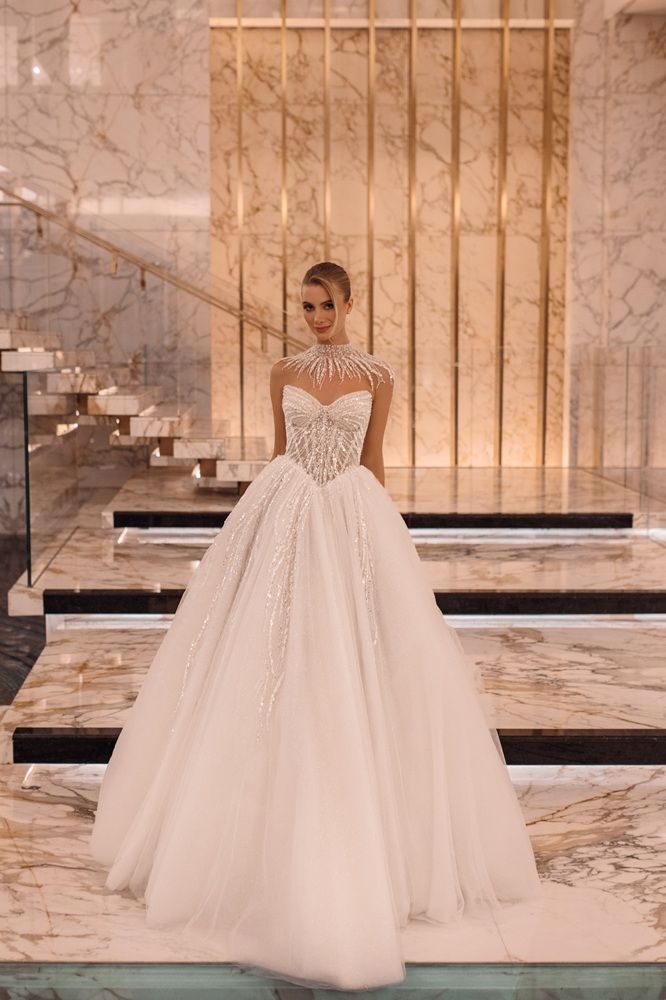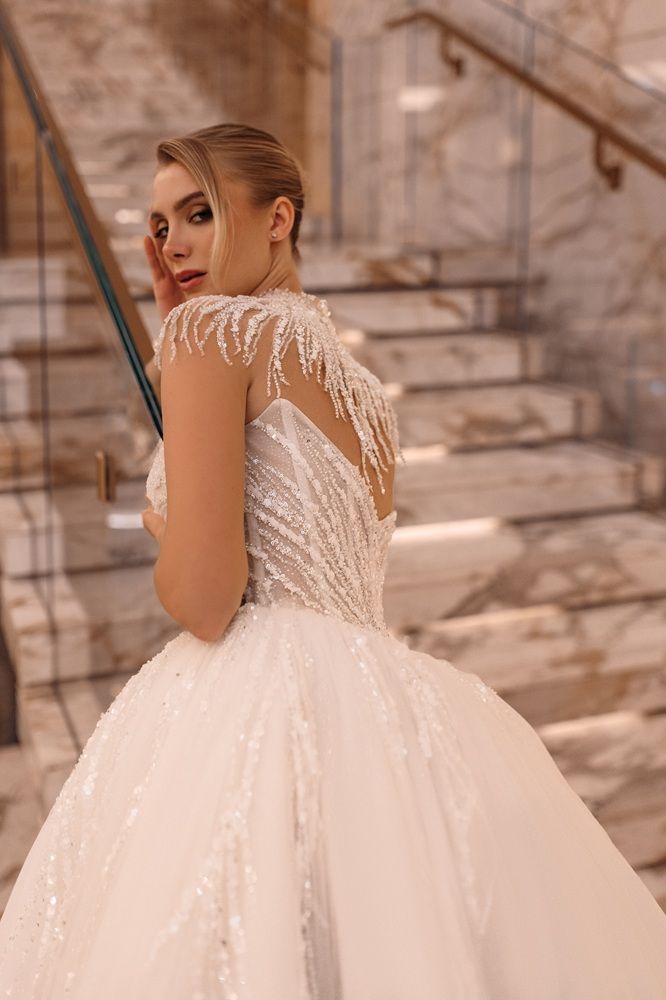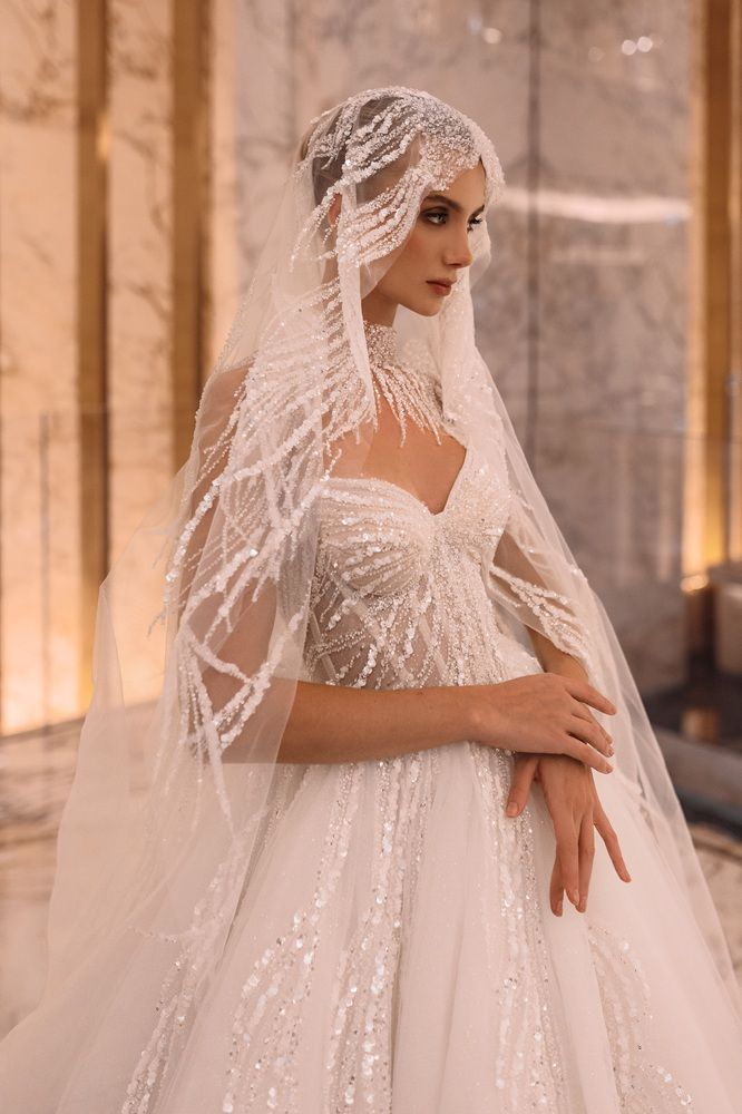 Luxury style wedding dress with basque waistline, mathching shimmering veil and removable neck decor.