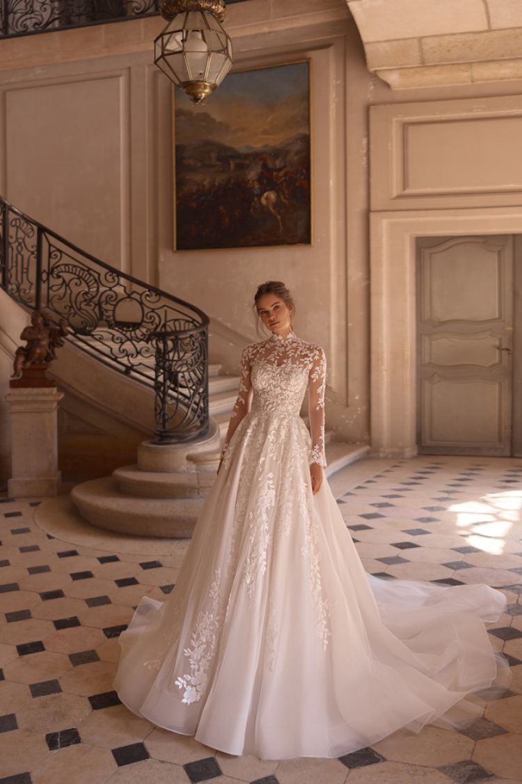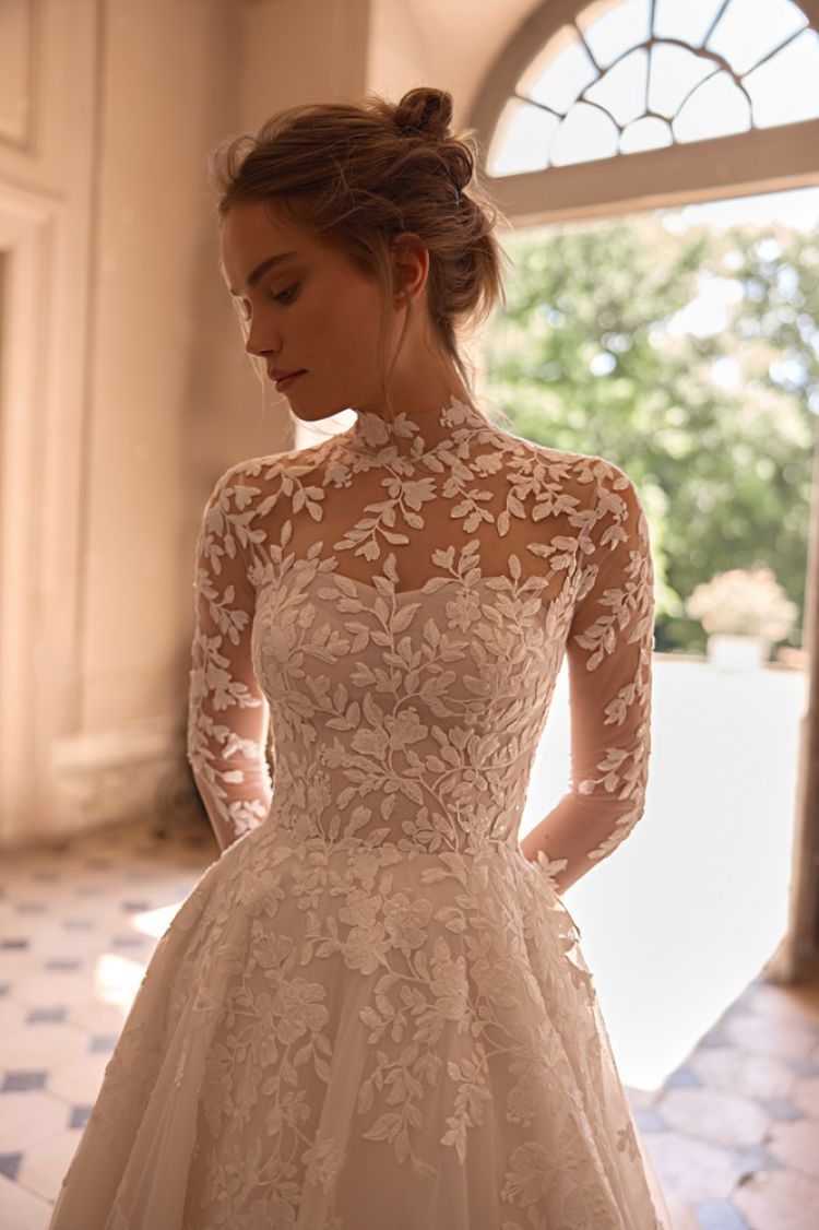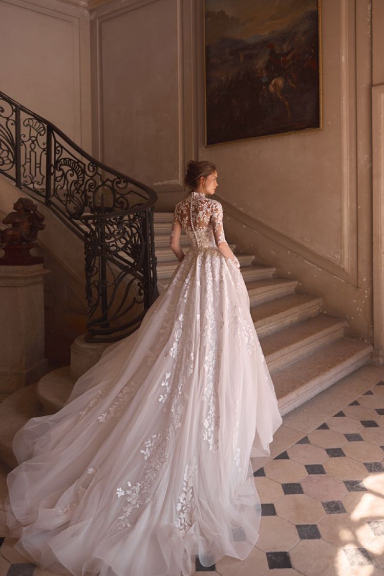 Long-sleeved wedding dress with long lace train. Perfect for hijabi brides.