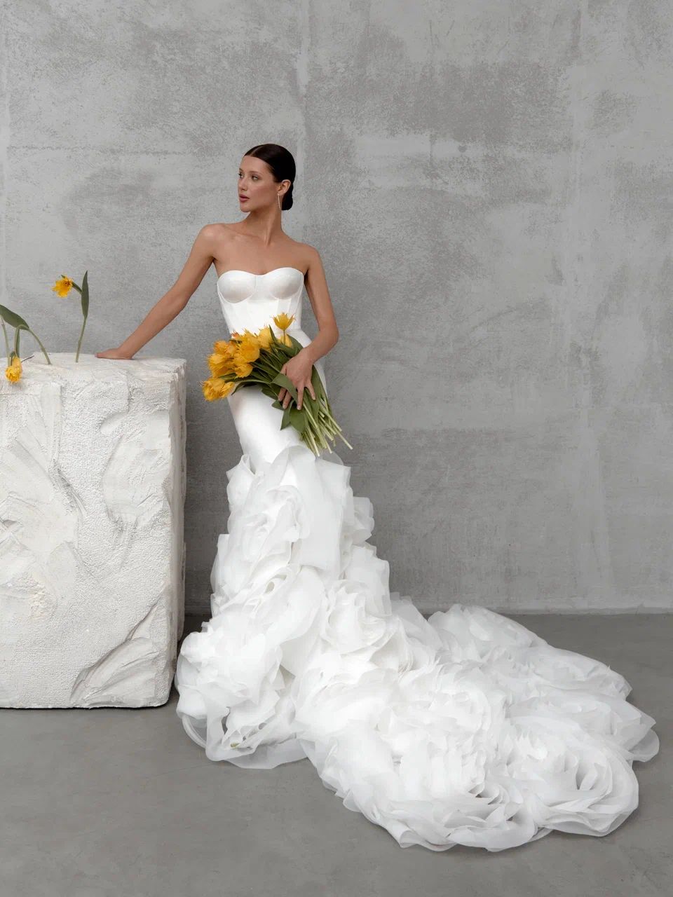 Luxury mermaid cut wedding dress with fully decorated floral bottom, structure top corset.