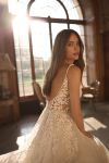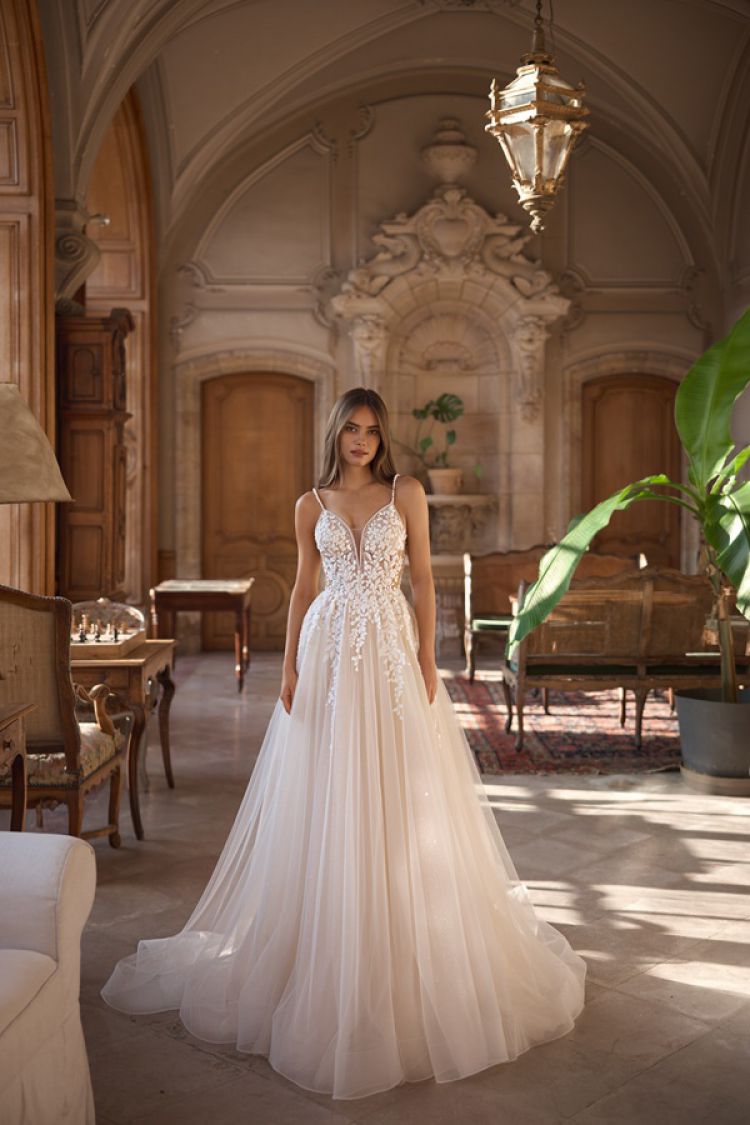 Elegant beach or garden style wedding dress with spaghetti straps, decorated with floral lace. The straps are covered with pearls.