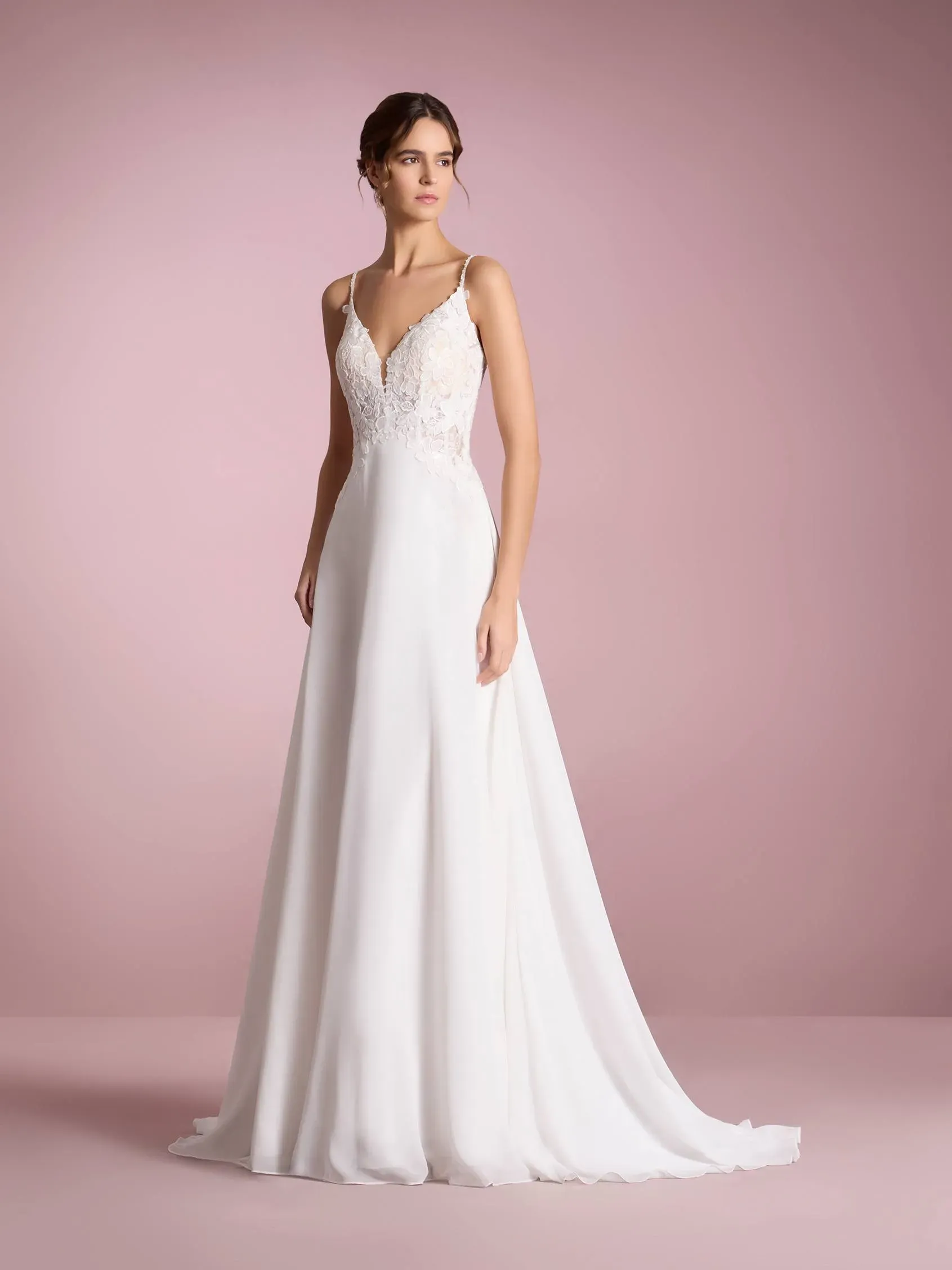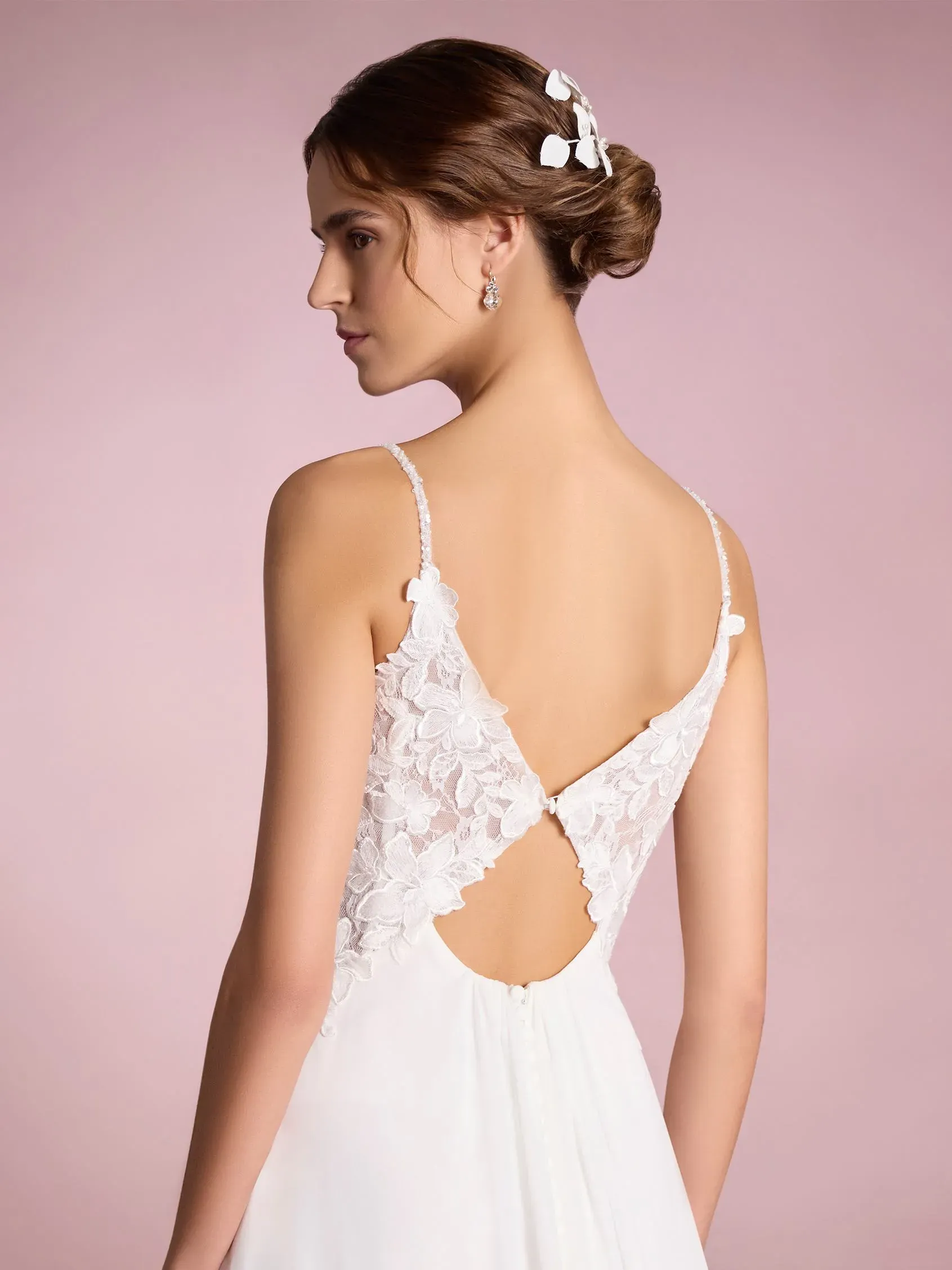 Lace floral pattern top with V neckline, high waist wedding dress with spaghetti straps and an elegant back element. The skirt is made of chiffon allowing this dress to be chosen for both garden and beach wedding in Dubai.