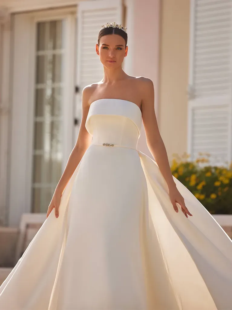 A-line pique wedding dress with straight across neckline, decorated with the beadwork at the natural waist-line.