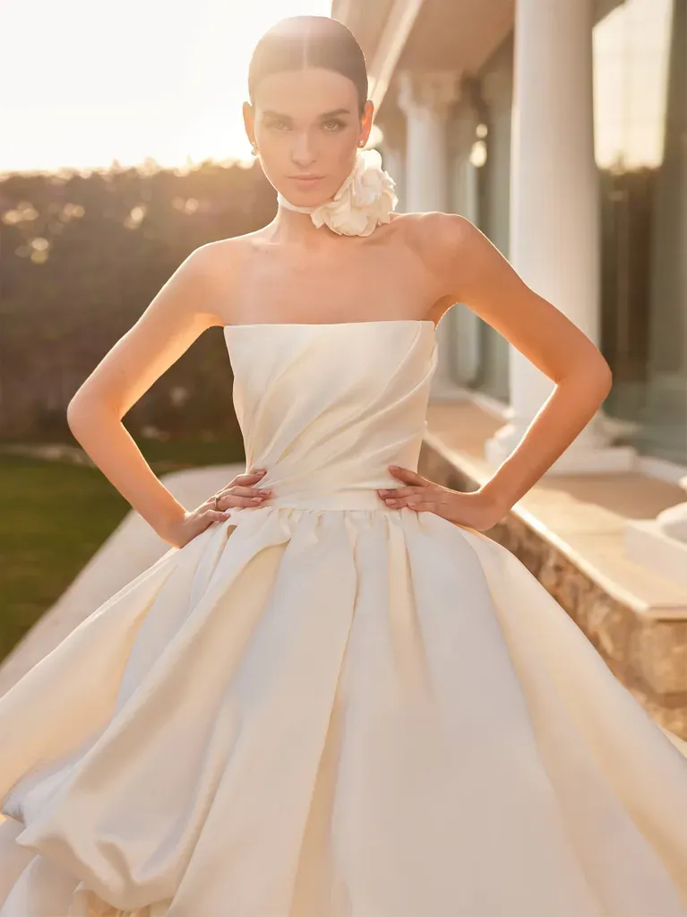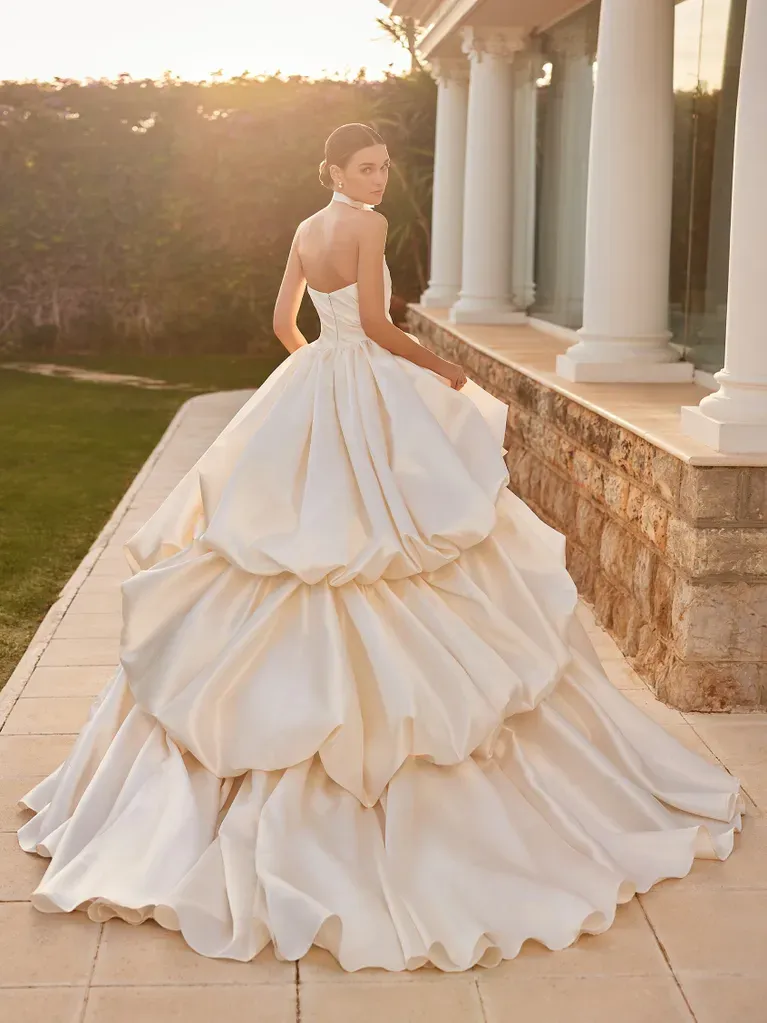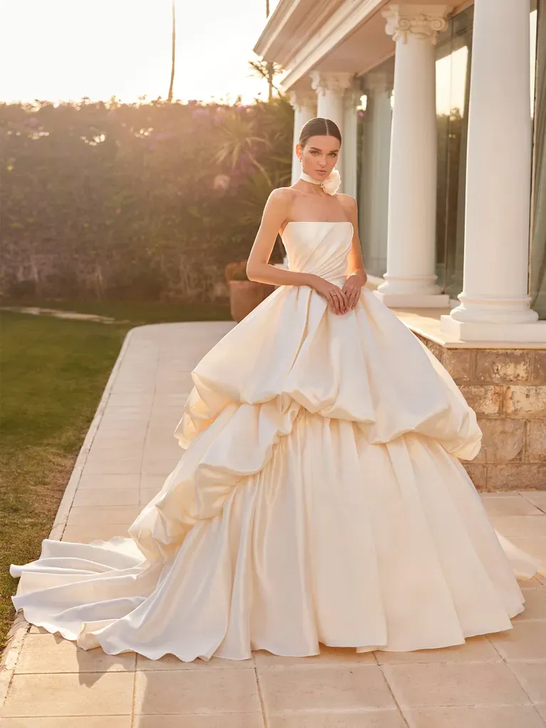Ballgown mikado wedding dress with layered trendy skirt, structured top with the straight across neckline.
