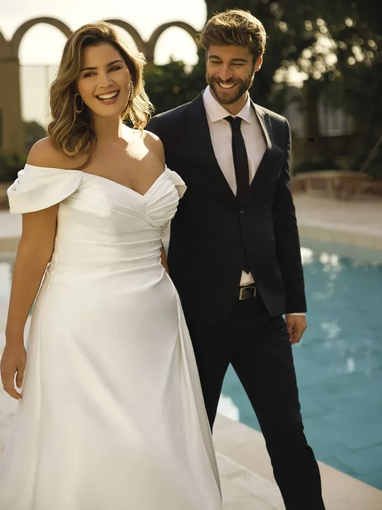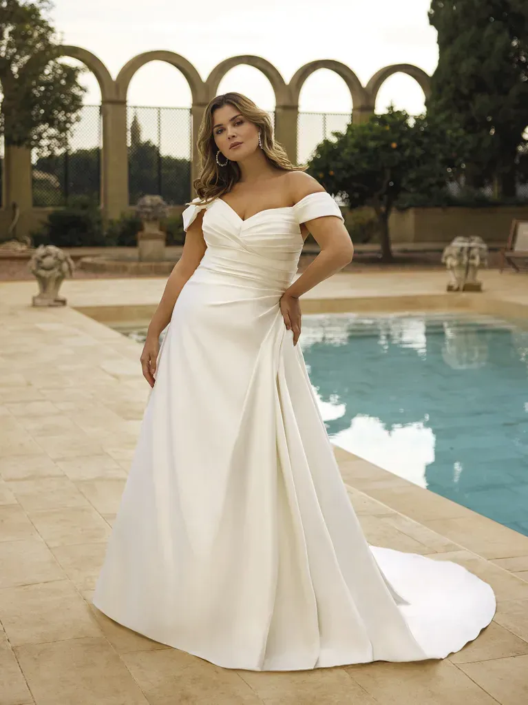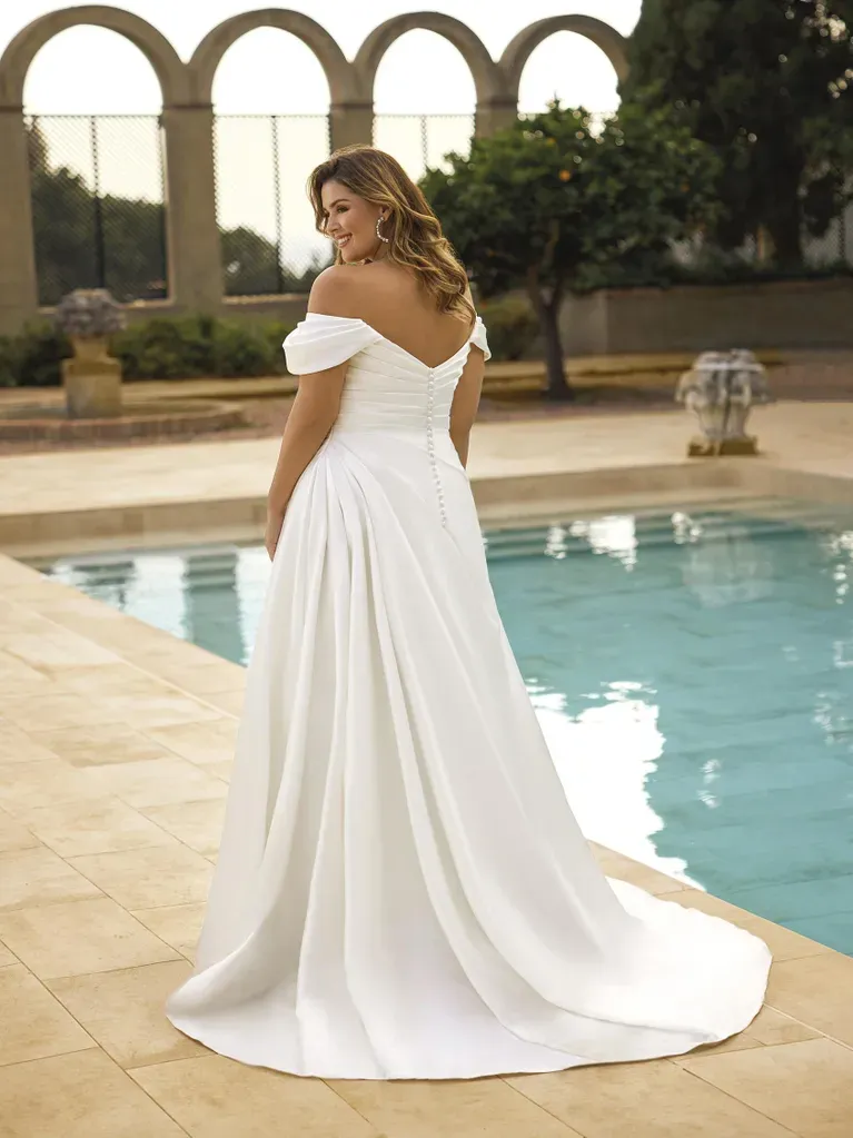 Draped corset is the perfect fit for curvy queens. Off-shoulder straps always look elegant. Wedding dress made of glossy mikado.