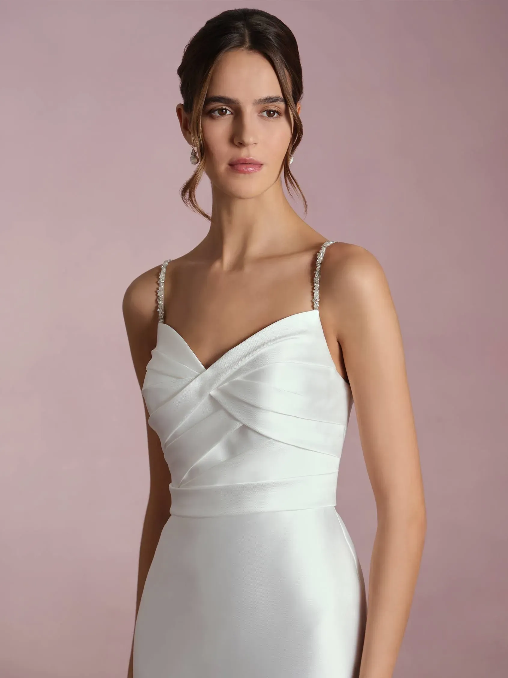 Mermaid wedding dress with satin draped sweetheart neckline. Decorated with tiny spaghetti beaded straps.