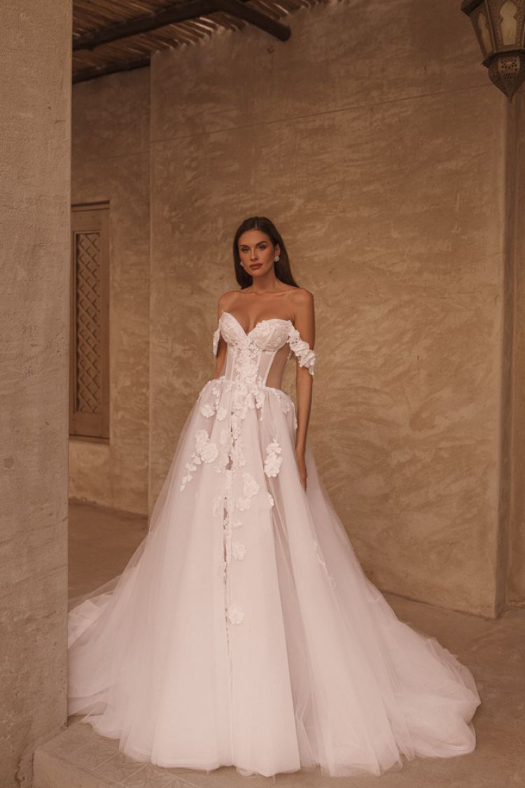 Luxury A-line wedding dress decorated with 3D flowers unique lace, open sides and off-shoulder straps.