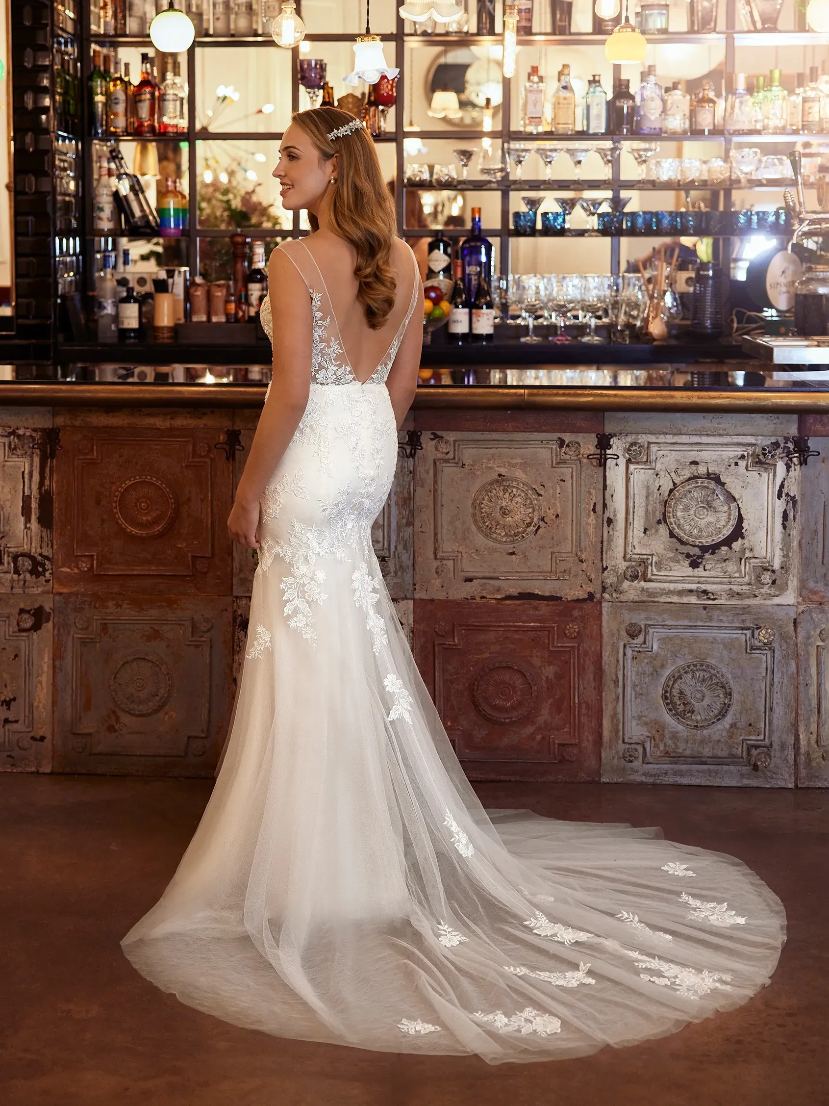 Mermaid cut lace wedding dress with sheer back design.