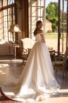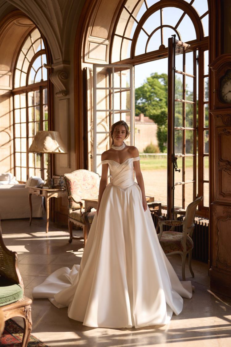 Off-shoulder neckline with basque waistline and draped top. Wedding dress made of satin.
