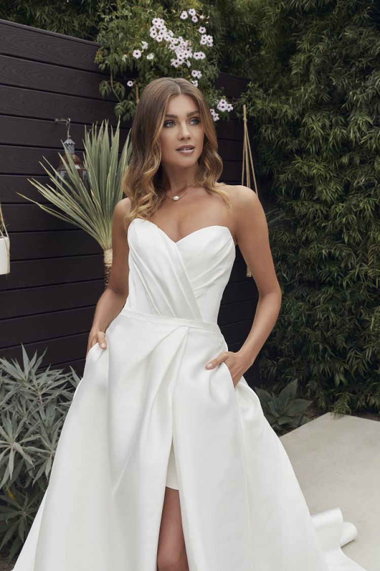 Satin A-line dress with sweetheart neckline and a sexy front slit.