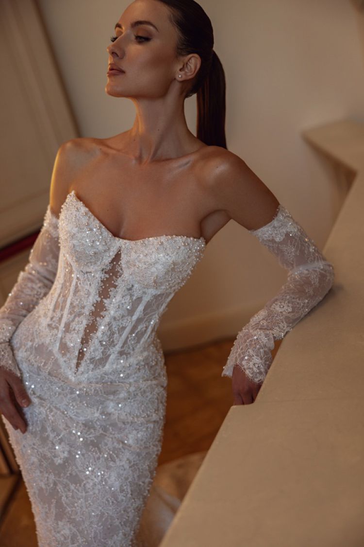 Shimmering lace basque waitsline wedding dress.