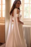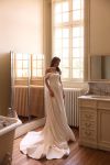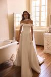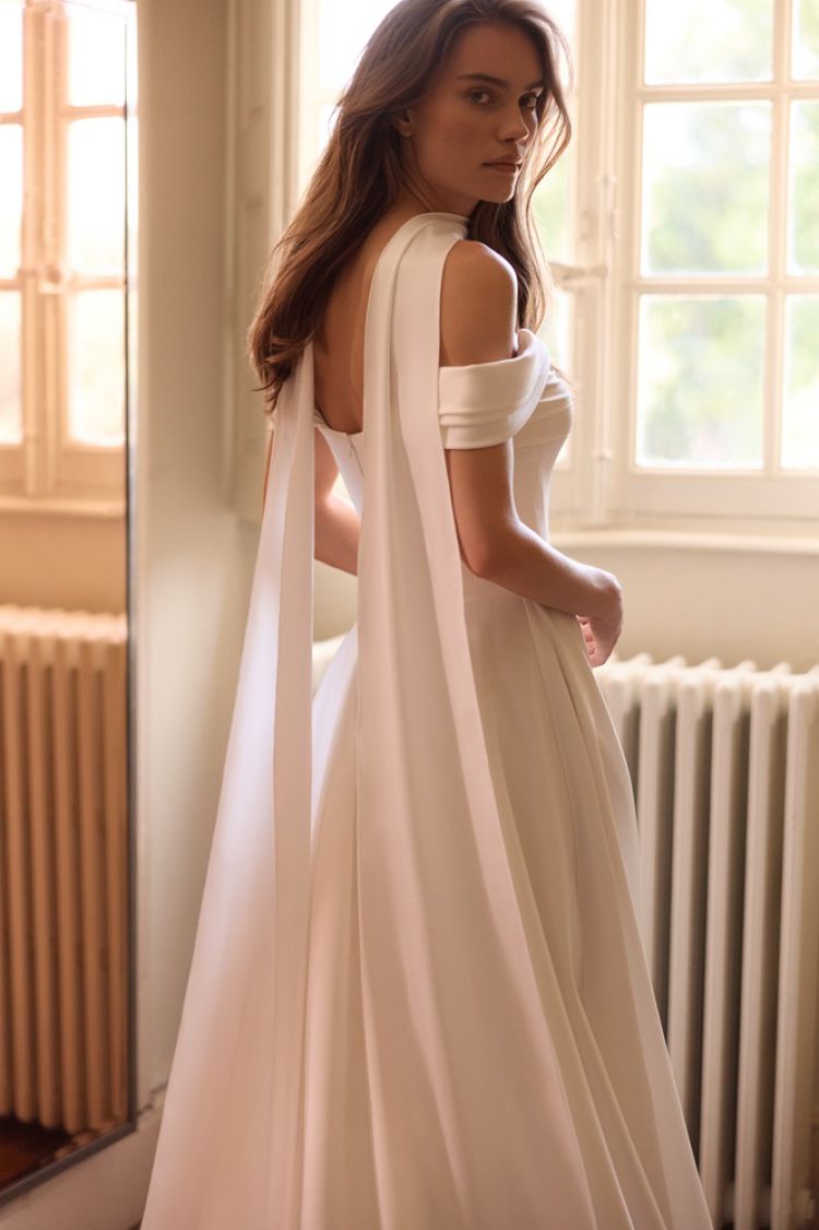 Off-shoulder neckline with sweetheart form. Basque waistline wedding dress fully made of satin.