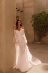 Luxurious lace mermaid style wedding dress with open shoulders and long sleeved and a detachable overskirt.