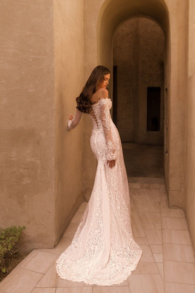 Lace mermaid wedding dress with off-shoulder neckline, sweetheart shape and detachable overskirt.