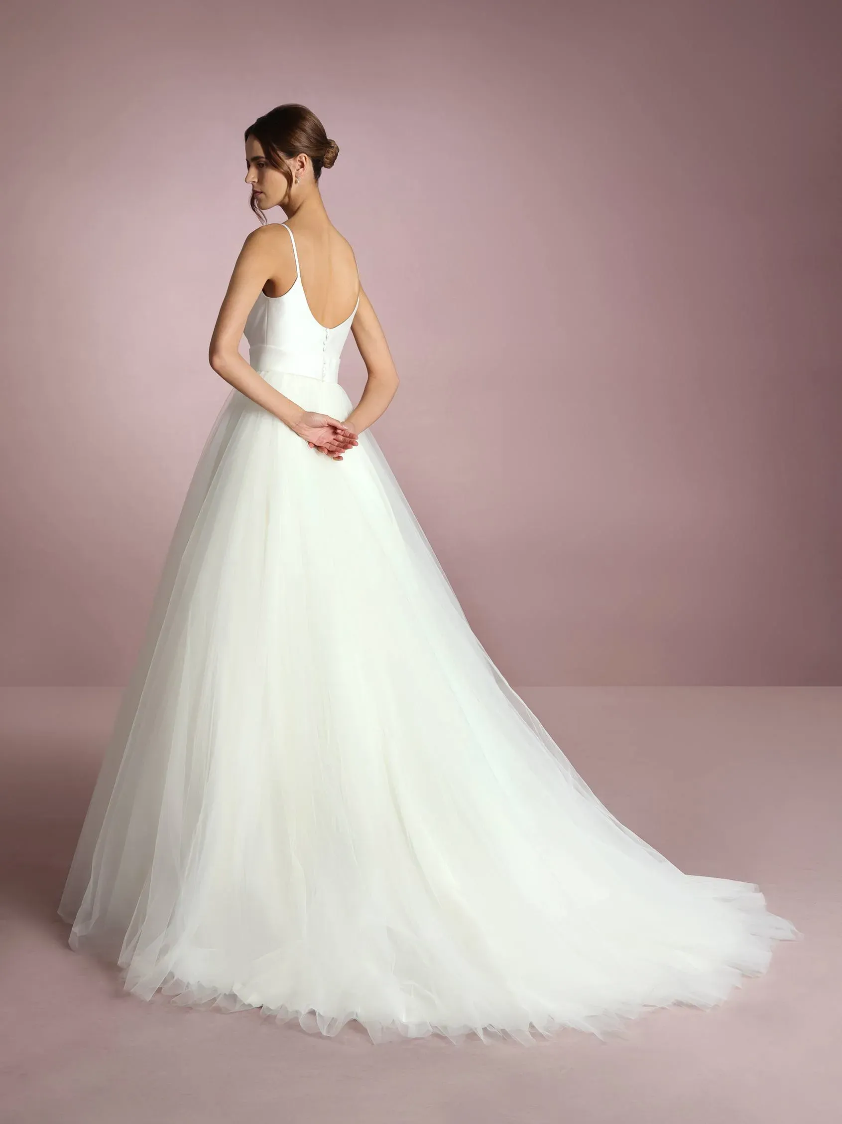 A-line satin draped top wedding dress with spaghetti straps, A-line tulle volumed skirt.