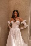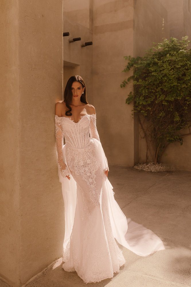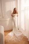 Cremona mermaid style wedding dress with scoop neckline, detachable off-shoulder straps, decorated with lace, with wonderful lace train.