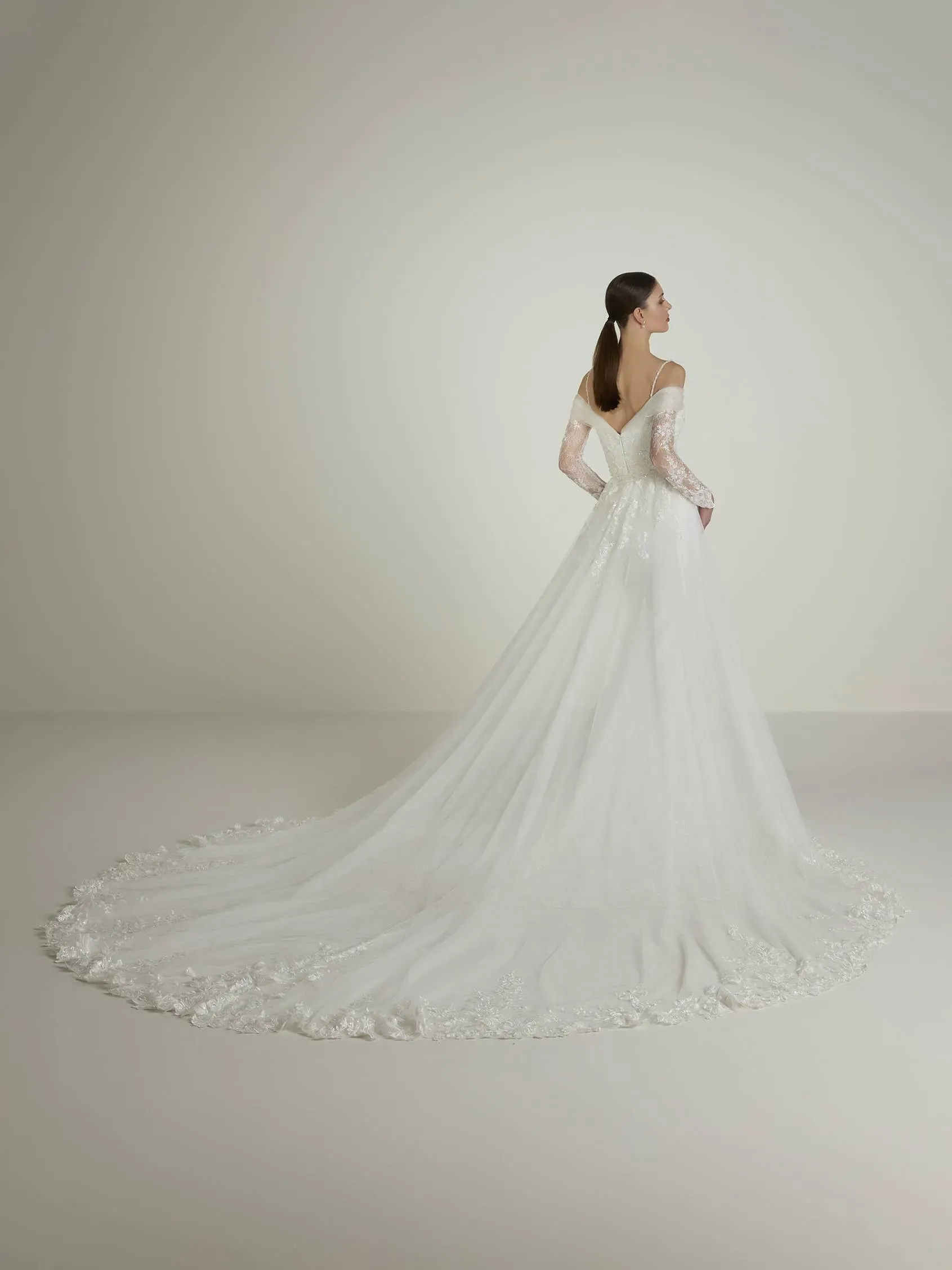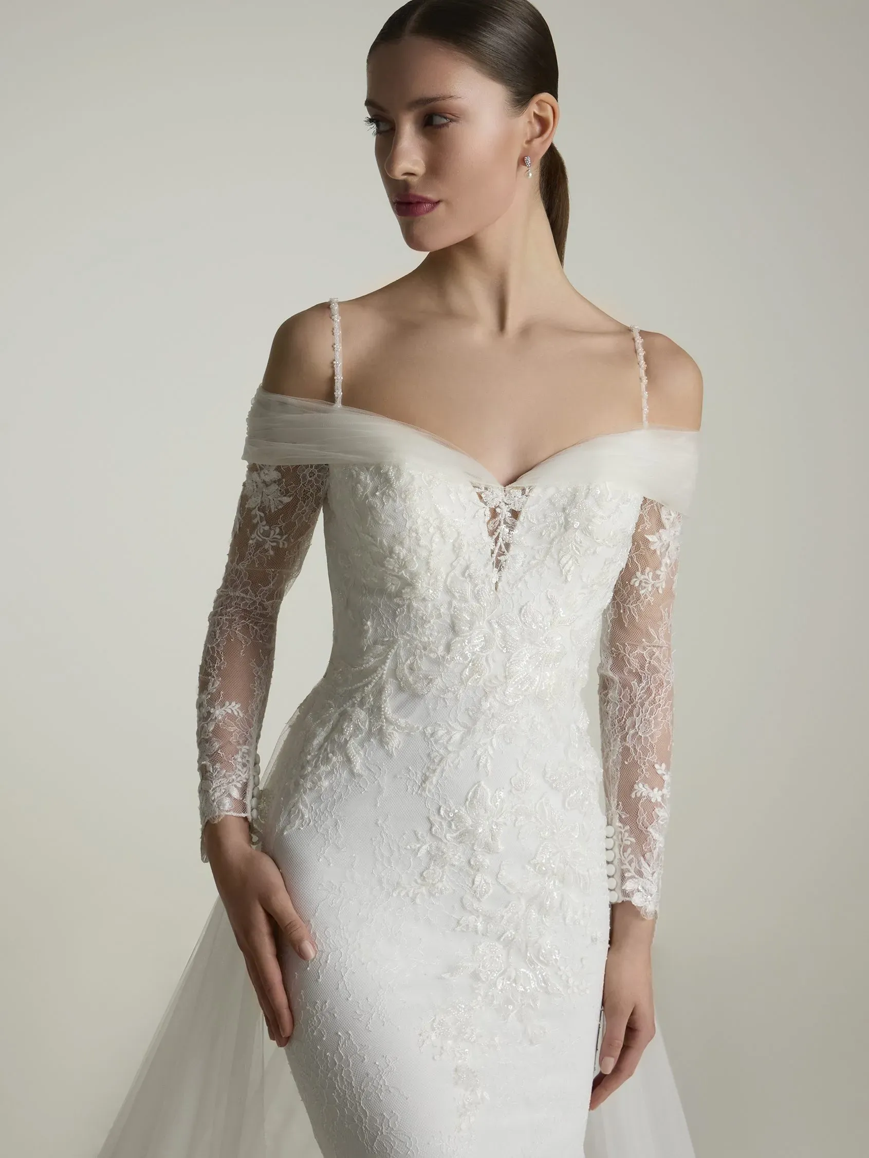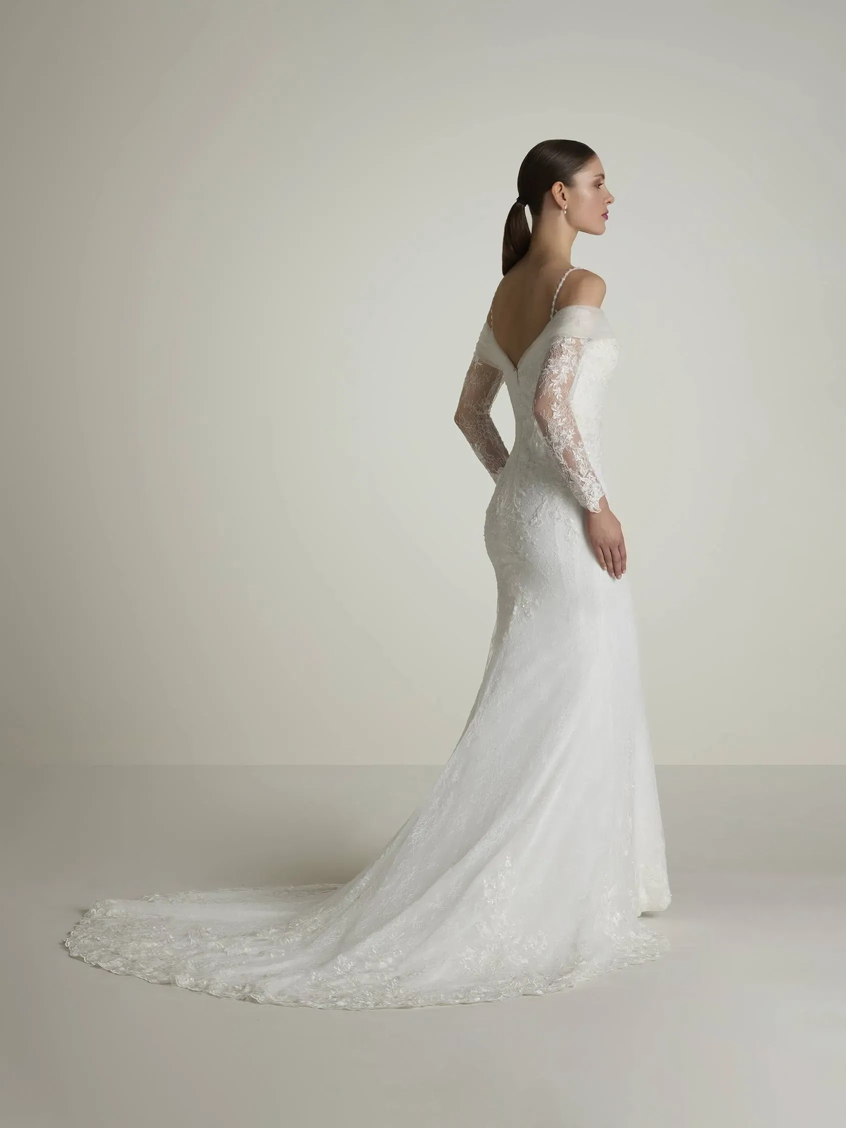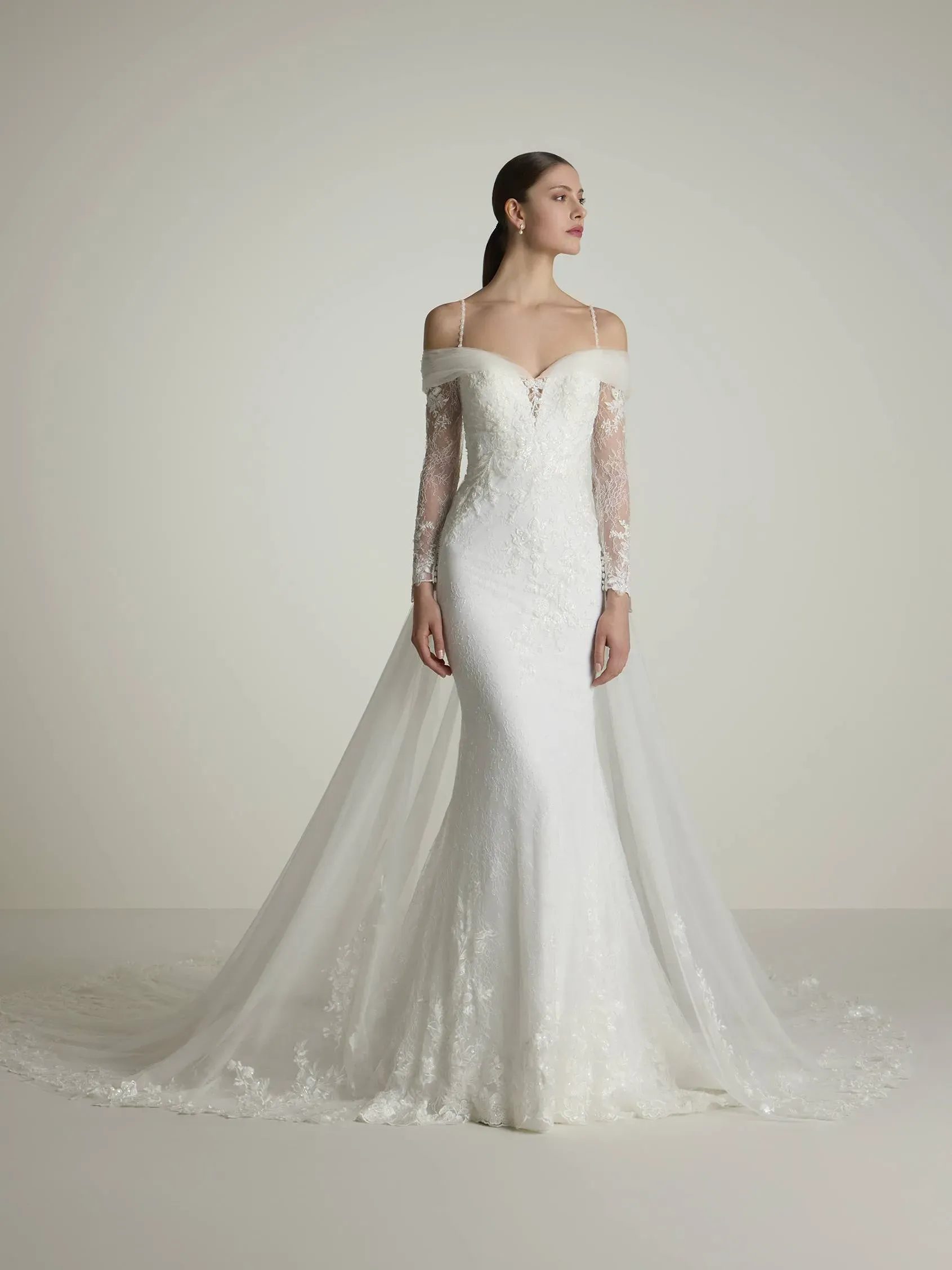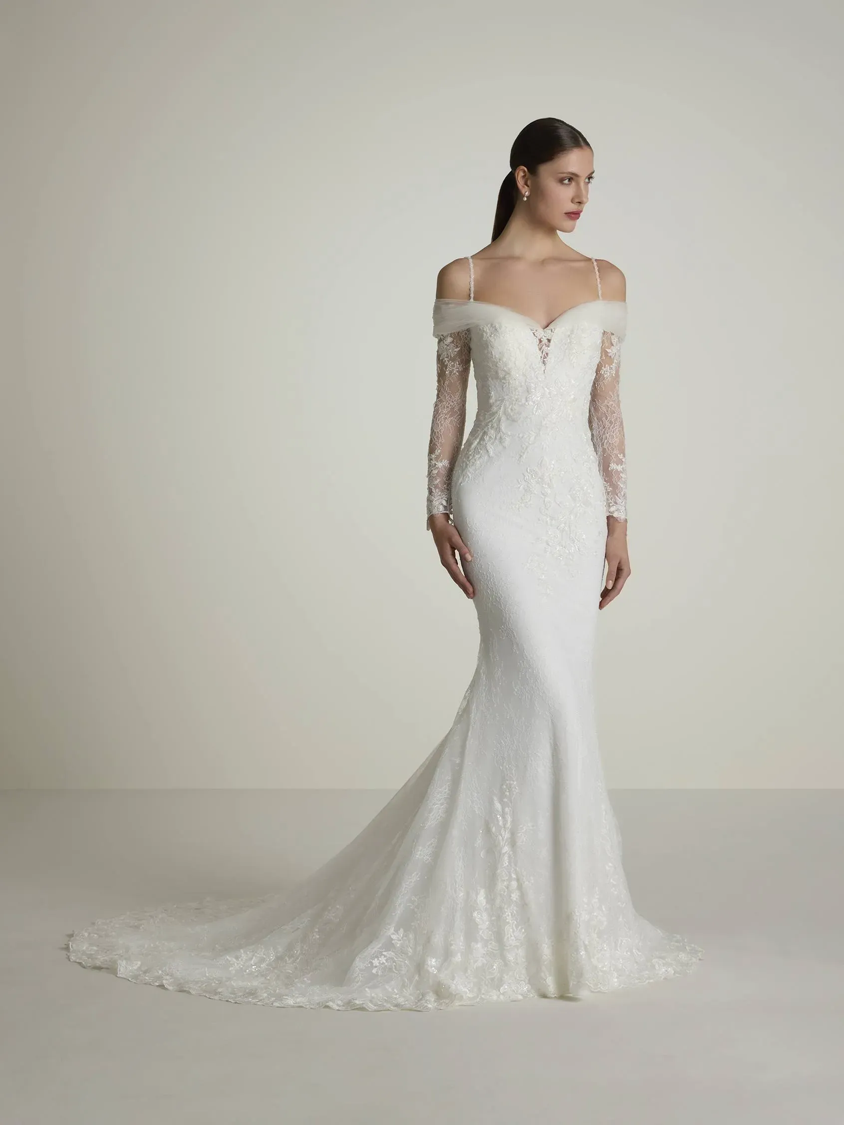Mermaid lace wedding dress fully decorated with rhinestones with elegant sweetheart neckline and long-sleeves with open shoulders. An exclusive masterpiece of a bridal styles.
