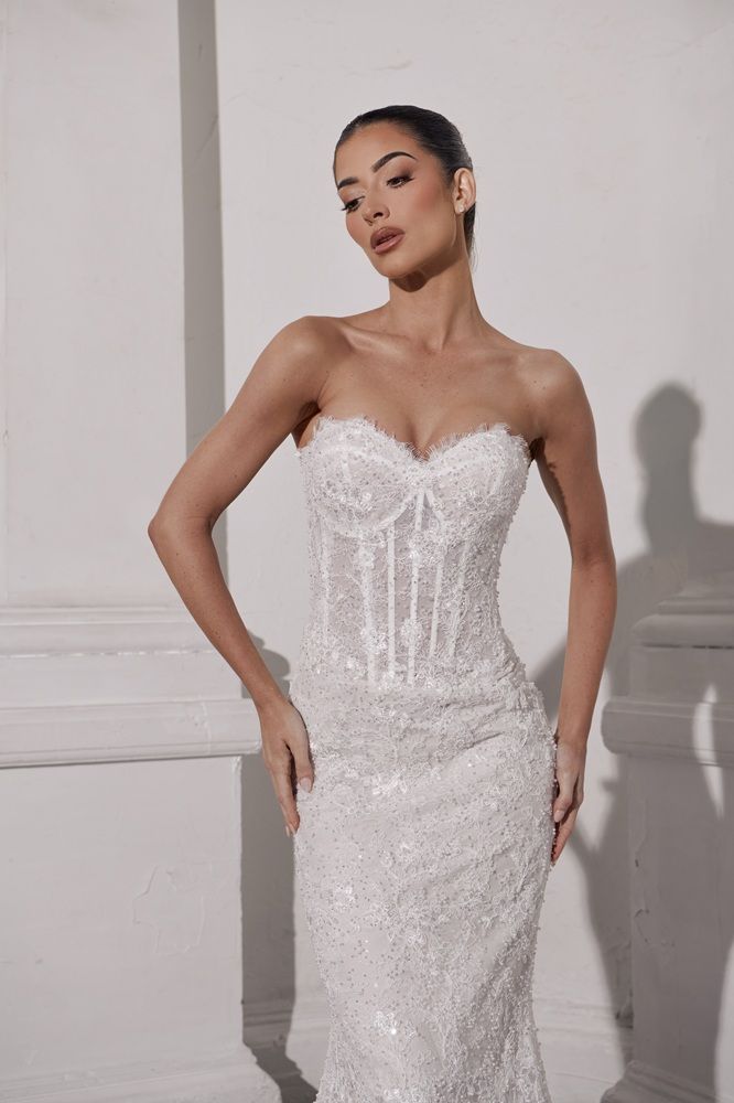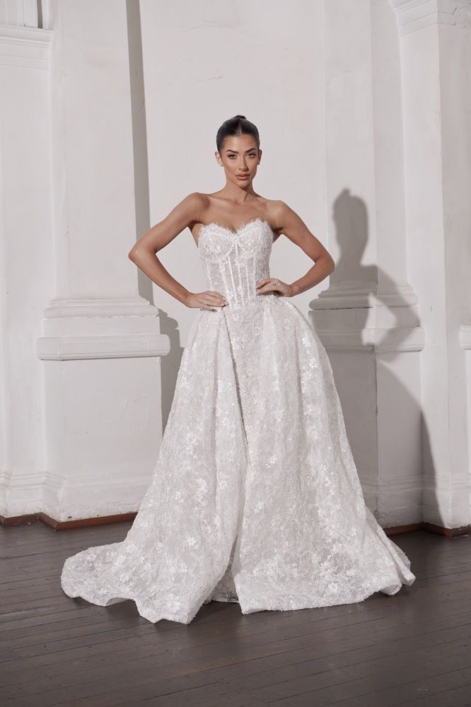 Luxury lace mermaid wedding dress with voluminous overskirt made of the matching lace.