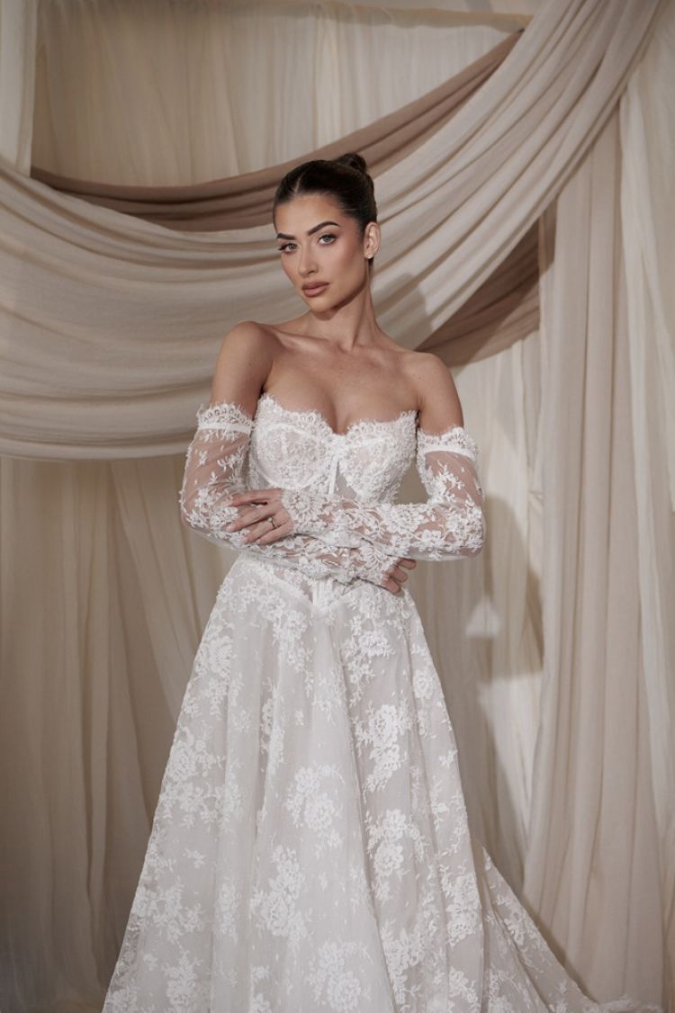 Classica lace style with trendy basque waistline, detachable sleeves.