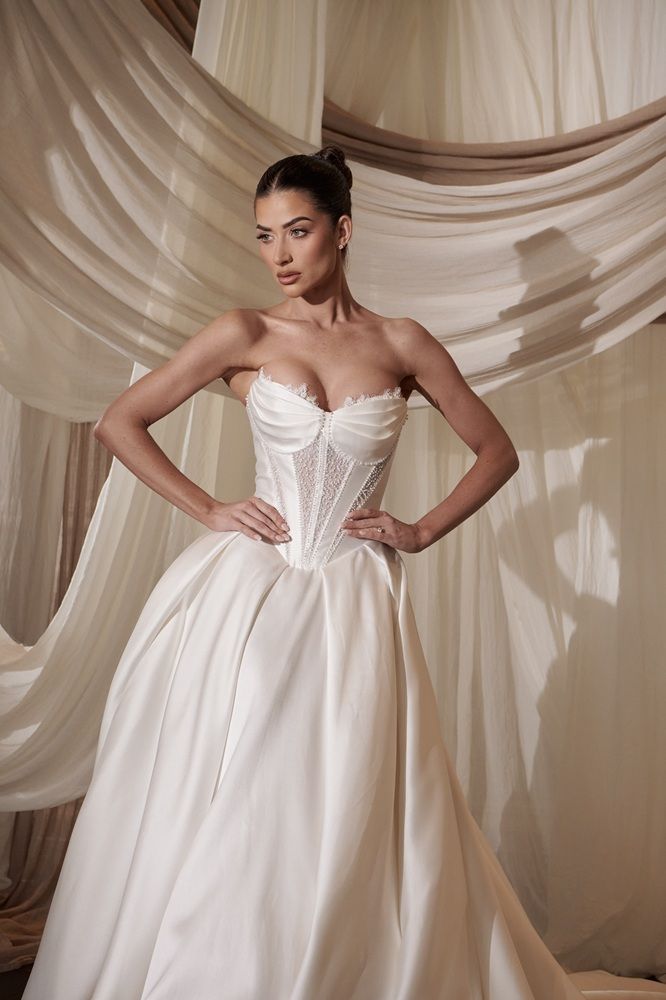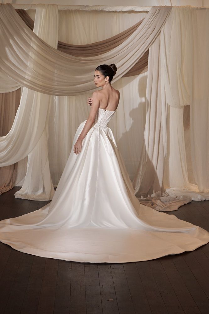 Regal satin wedding dress with pearl decorated top and volumed skirt.