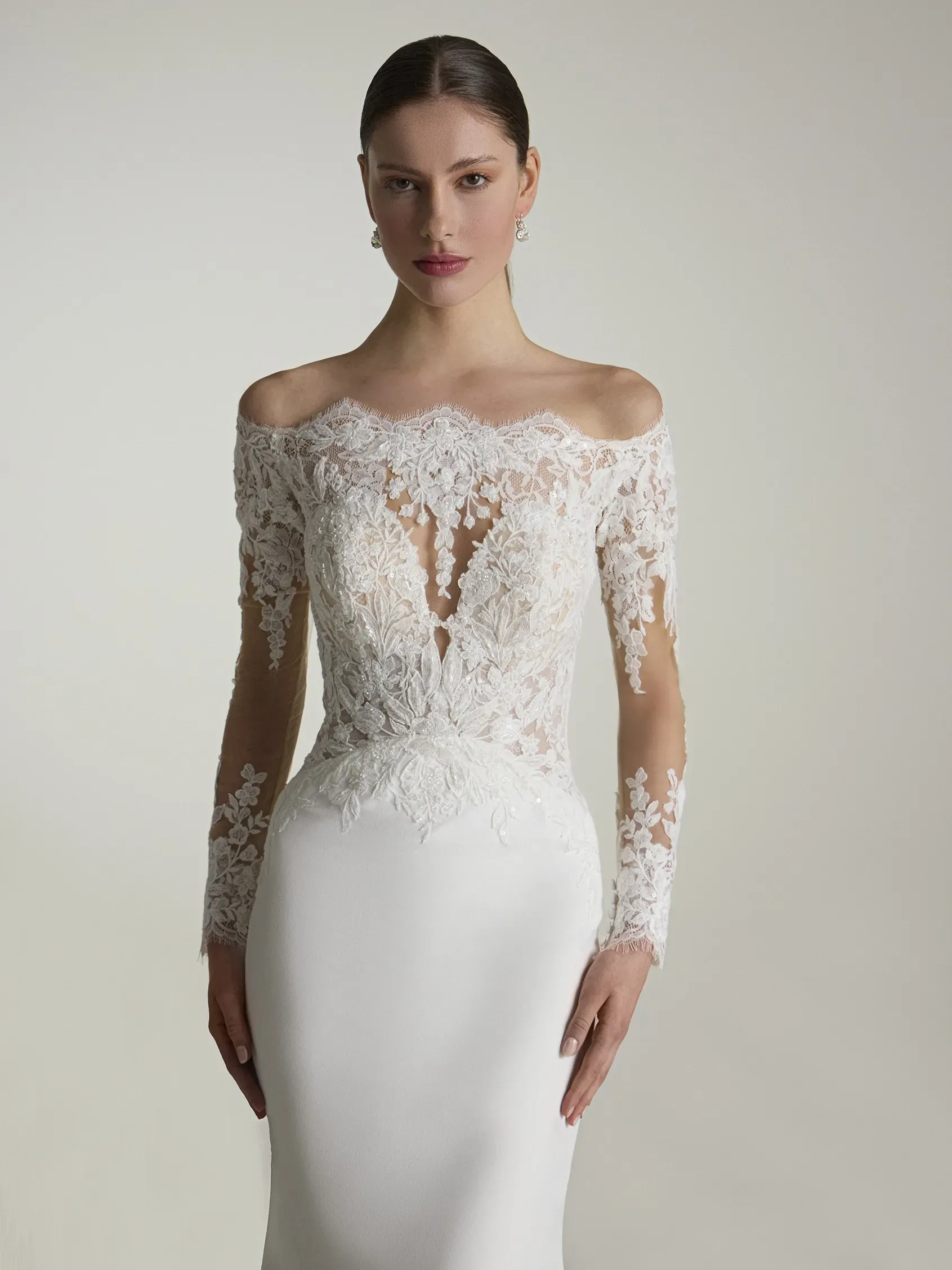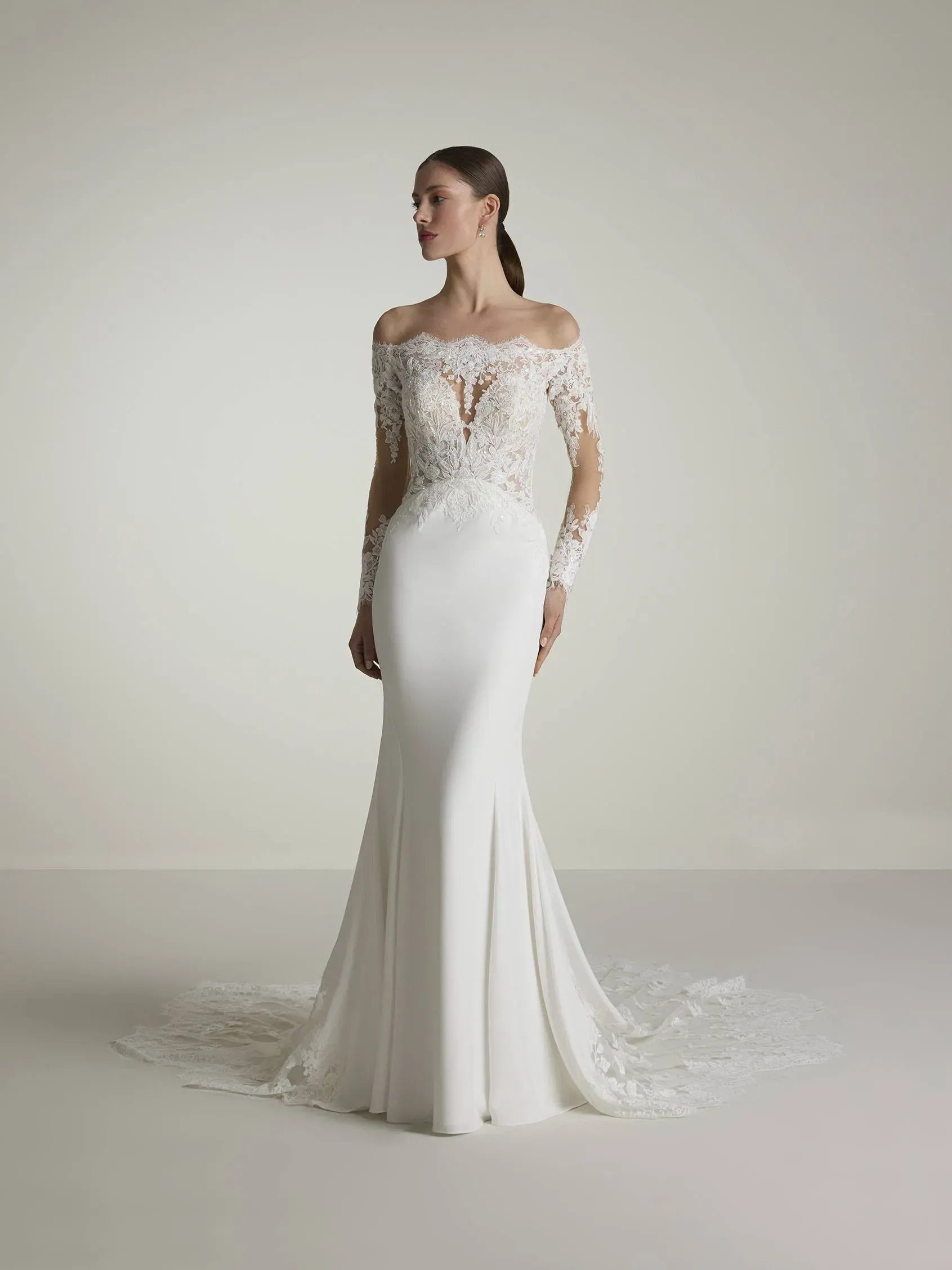 Lace long sleeved wedding dress with long detailed train and an off-shoulder neckline.