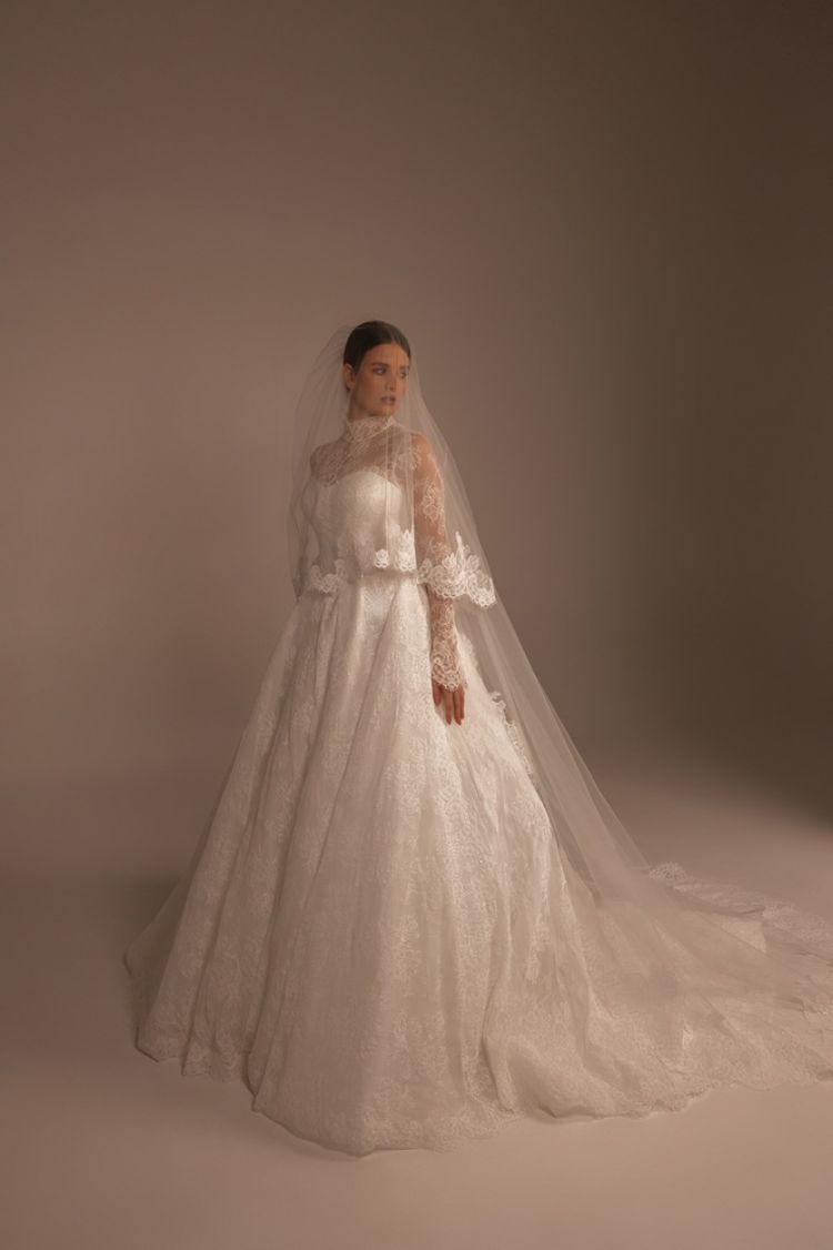 Lace ballgown wedding dress with basque waistline and fully lace top and flared long sleeves.