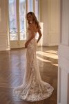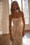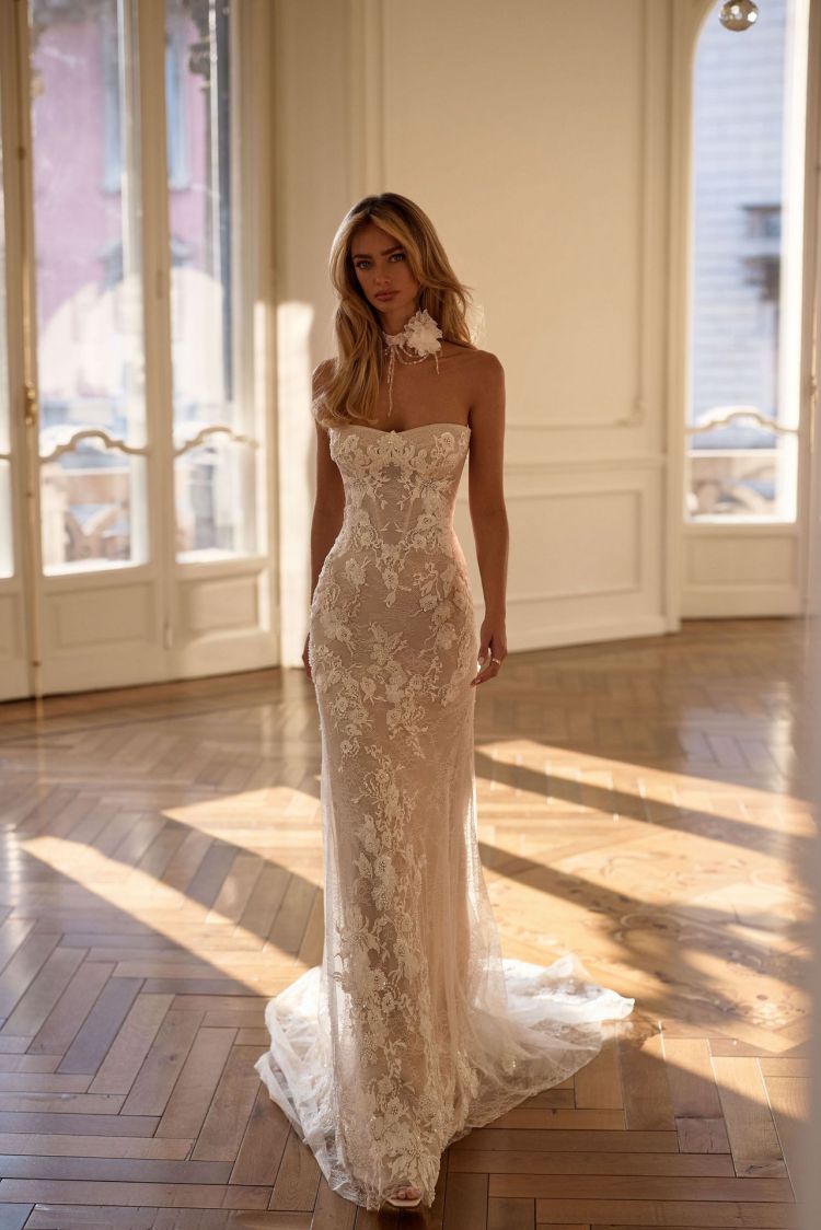 Mermaid cut lace wedding dress decorated with floral patterns and pearls/