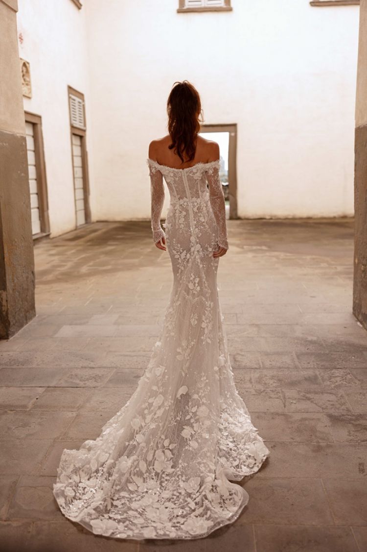Lace mermaid style wedding dress with long sleeves, off-shoulder neckline.
