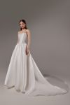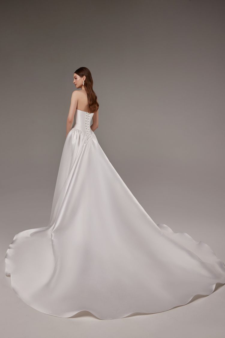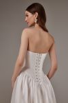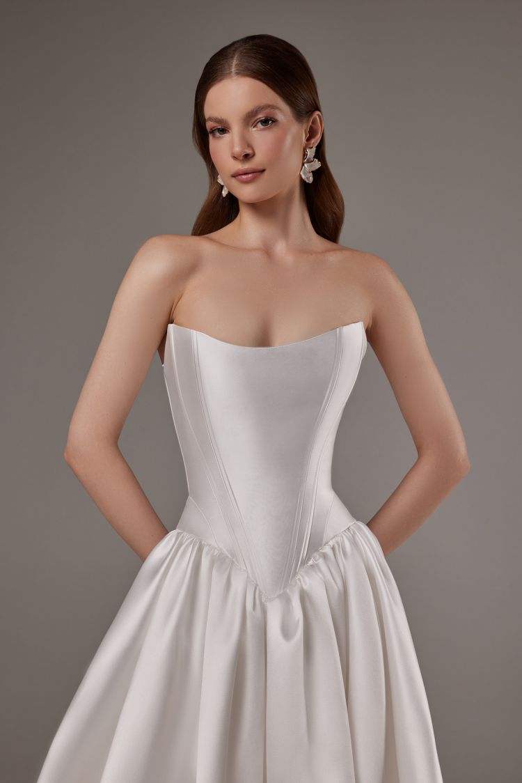 Low corset style wedding dress with A-line silhouette, made of satin.