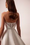 Satin A-line wedding dress with front slit and elegant detailed back with buttons along the back.