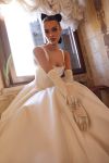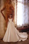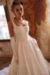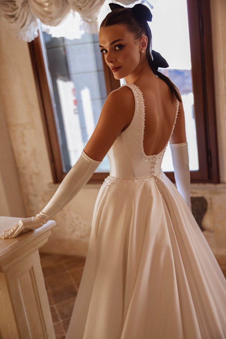 Satin ballgown wedding dress decorated with pearls with basque waistline.