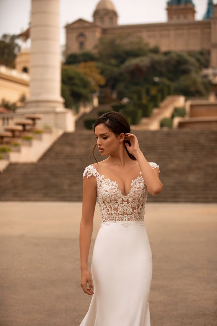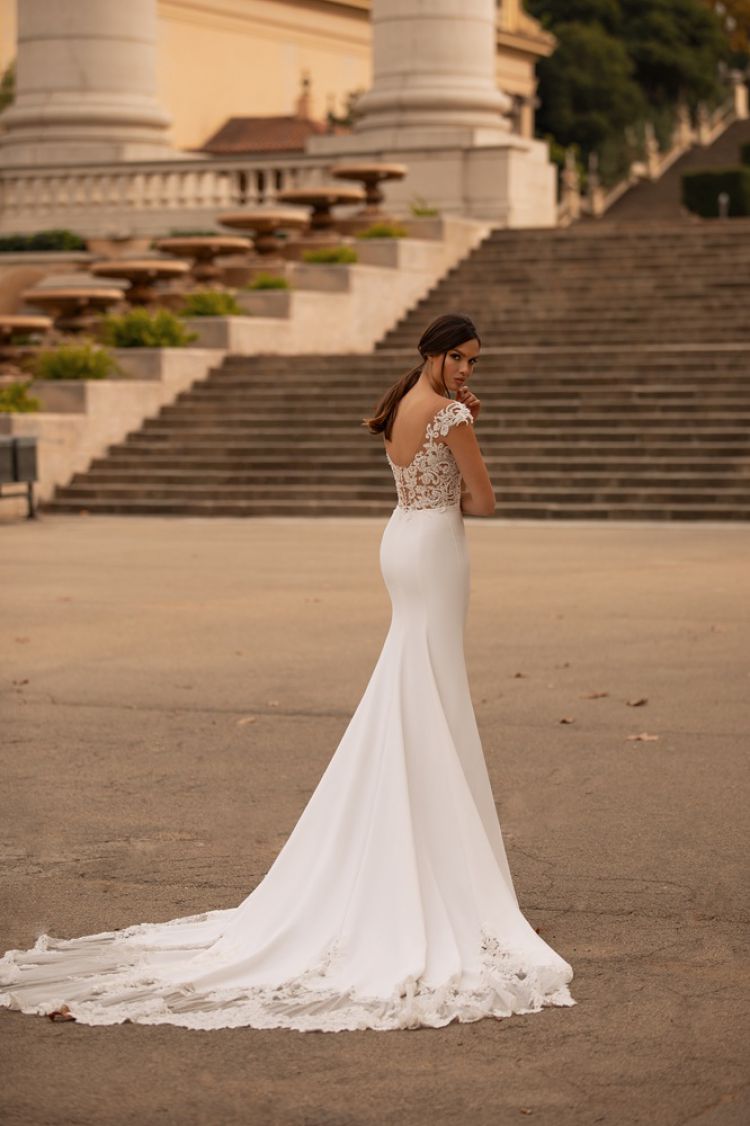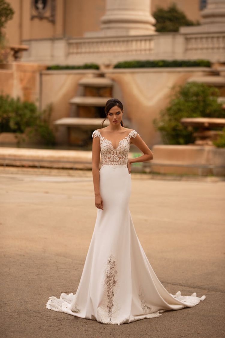 Cremona and lace wedding dress with V-neckline and scoop open back.