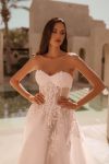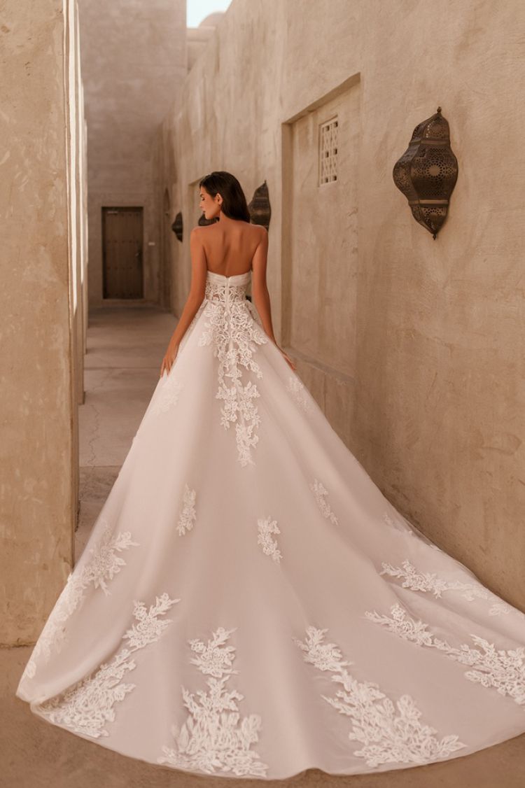 Luxurious lace A-line wedding dress with sweetheart neckline and decorated train.
