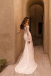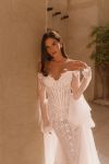 Luxurious lace mermaid style wedding dress with open shoulders and long sleeved and a detachable overskirt.