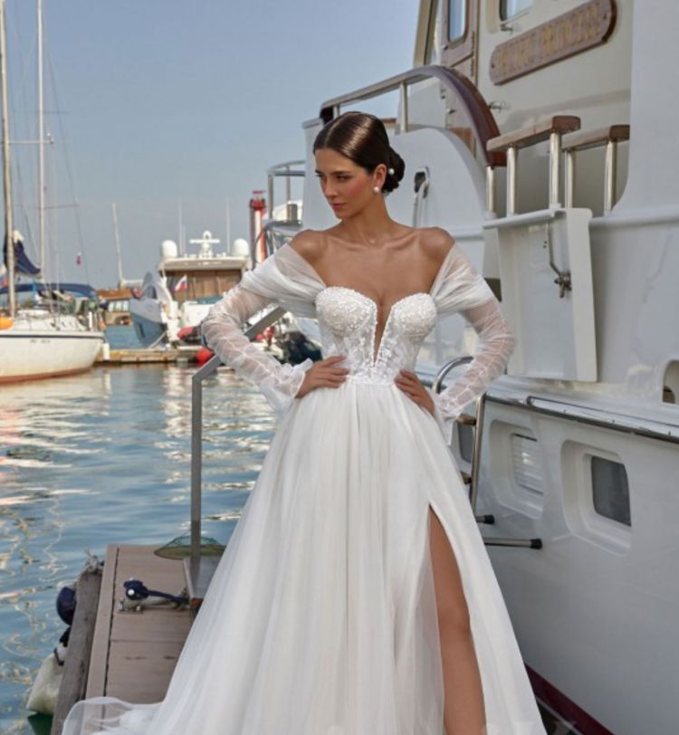 A-line beach style wedding dress with back lacing and tulle trendy sleeves